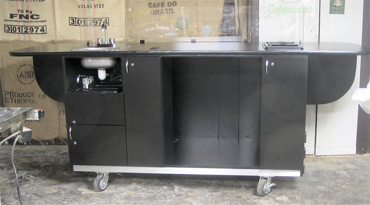 Latest revision along this line includes an undercounter slide out sink as well as a lighted display section and stainless steel 3 compartment sink configuration: